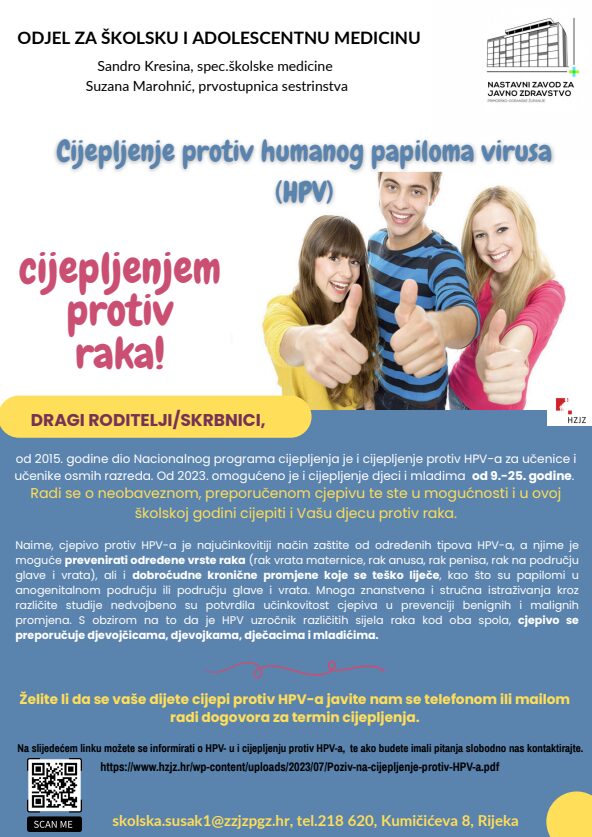 Roditelji učenika 5., 6. i 7. razreda mogu besplatno cijepiti svoju djecu. Za cijepljenje je potrebno dogovoriti termin izravno s ambulantom školske medicine Sušak.